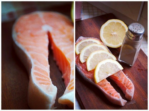 Стейк лосося помыть, посолить с двух сторон, выложить на фольгу для запекания ,а её в свою очередь — на противень . Посыпать специями и выложить дольками лимон . Фольгу завернуть, чтобы у нас получился конвертик .