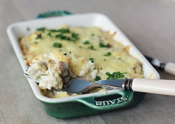 Филе курицы нарезать крупными кусочками, грибы «пластинками». Курицу и грибы положить в сковороду и обжарить. Пока жарится курица и грибы готовим заправку: в глубокой тарелке подавить чеснок, потереть туда сыр, добавить мелко порезанный укроп, залить кефиром, добавить приправ по вкусу и перемешать. Как потушилась курица и грибы, слить от них выделившийся сок (не весь, а так, чтобы ещё осталось немного, на ваше усмотрение) и залить туда заправку, тушить на маленьком огне ещё минут 10.