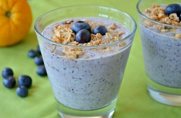 — Овсянку залить йогуртом/кефиром, добавить пюрированный банан и чернику (можно просто все ингредиенты соединить и взбить в блендере)