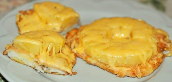 Филе помыть, нарезать на тонкие пластины, слегка отбить, посолить, посыпать черным молотым перцем.Немного взбить яйца.Отбивные обмакивать в яйцо, жарить с двух сторон до готовности. После переворачивания на вторую сторону — накрыть крышкой. На отбивные выложить по кольцу ананаса или его половинке — в зависимости от размера отбивной. Сверху посыпать натертым на крупной терке сыром. Поставить в хорошо разогретую духовку до расплавления сыра.
